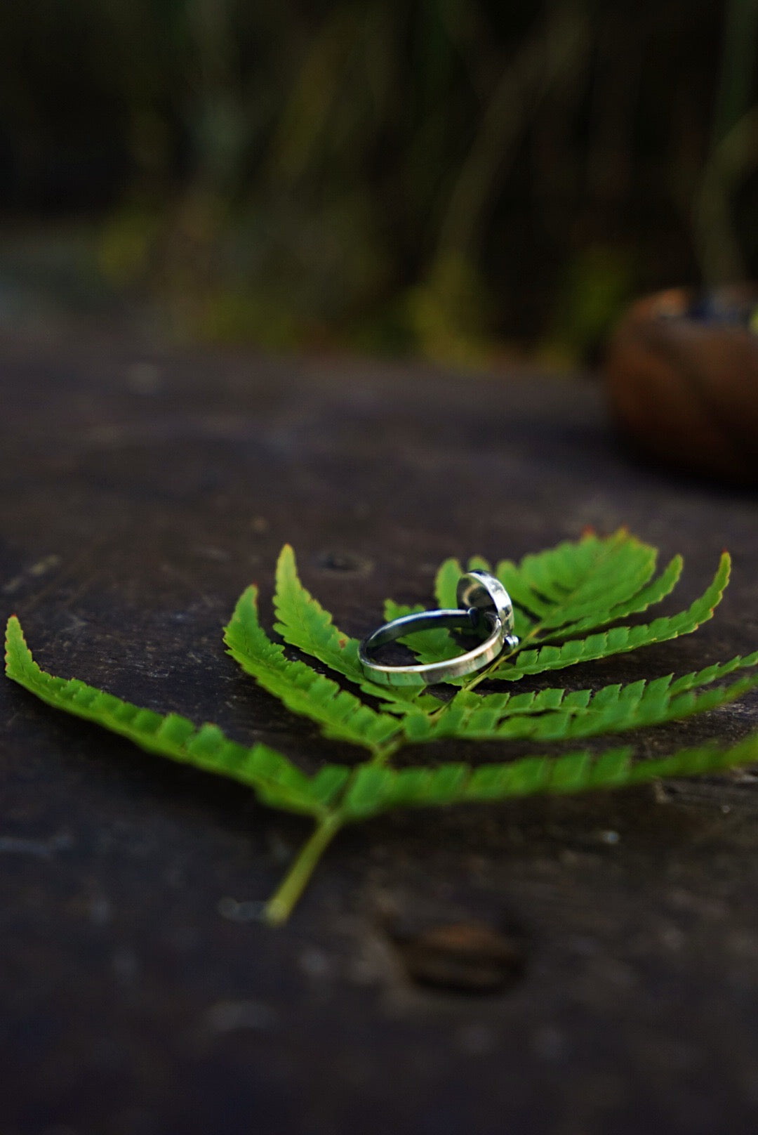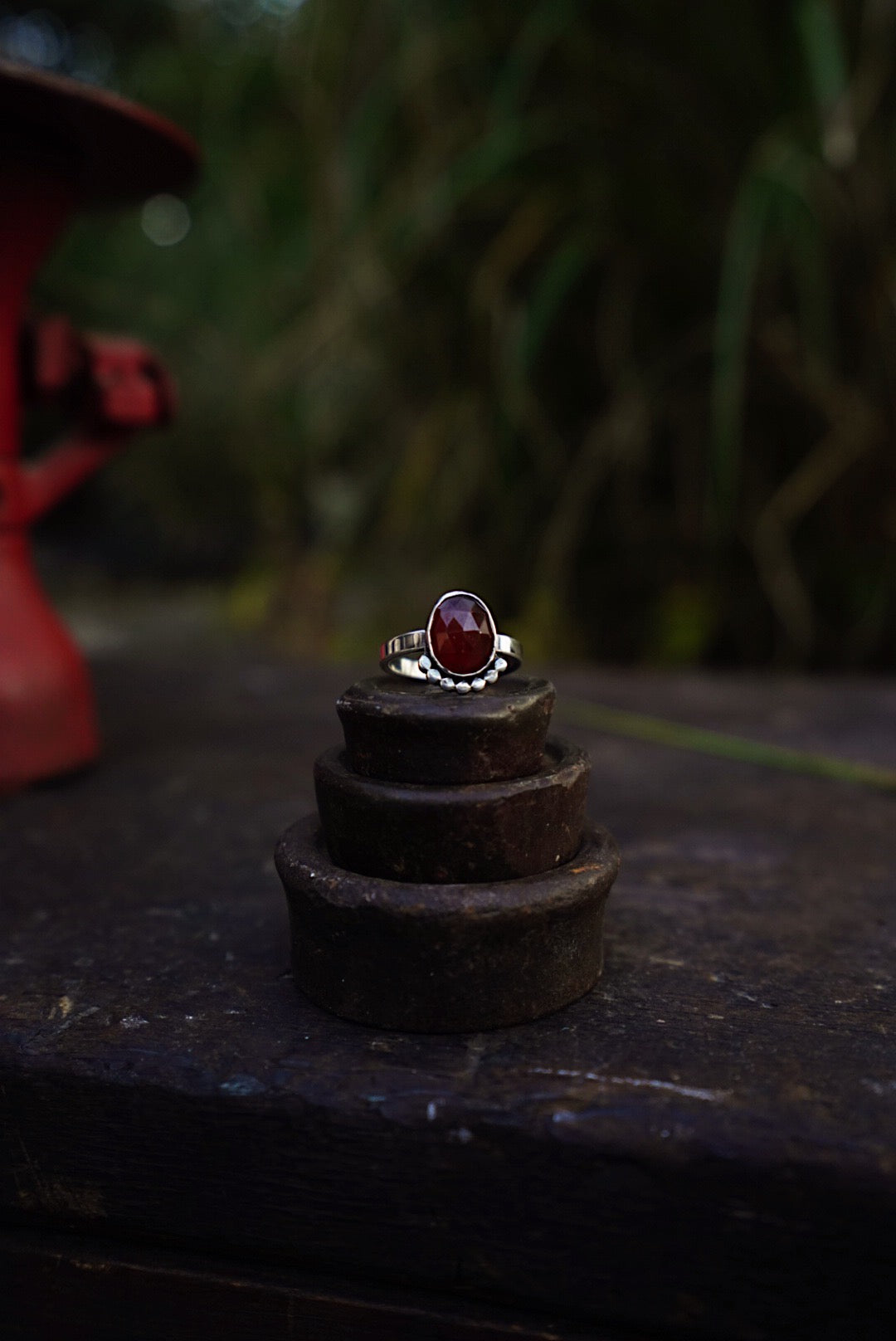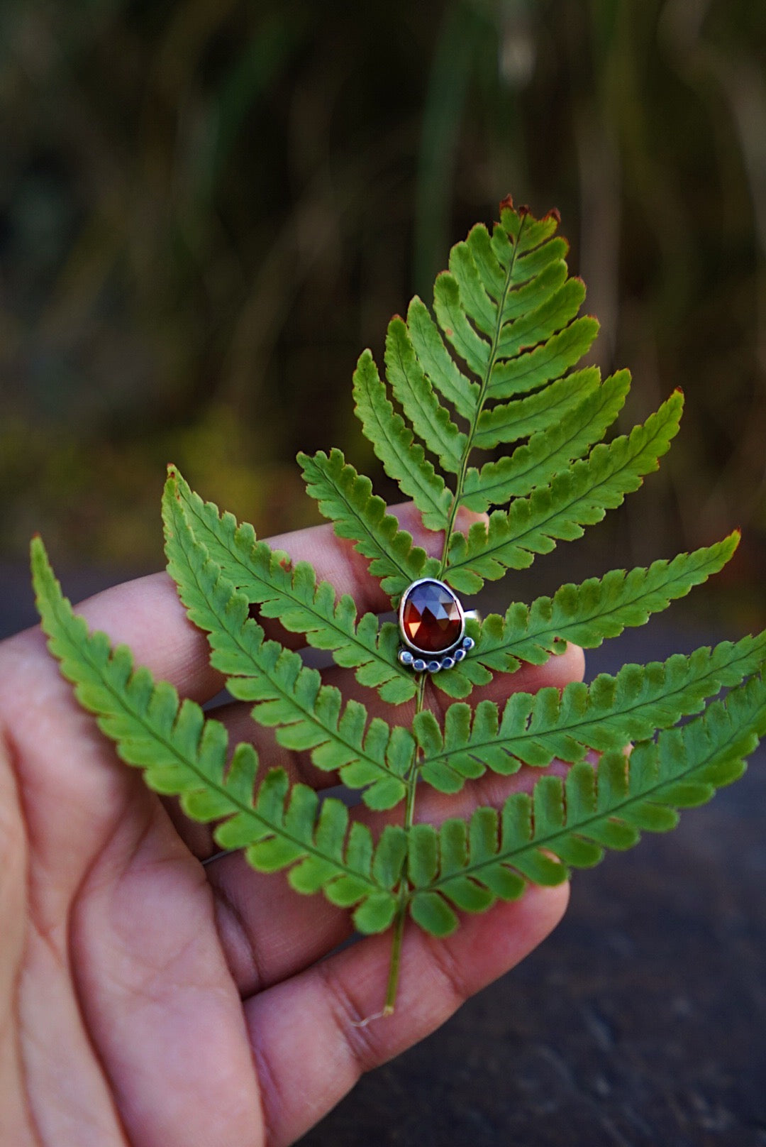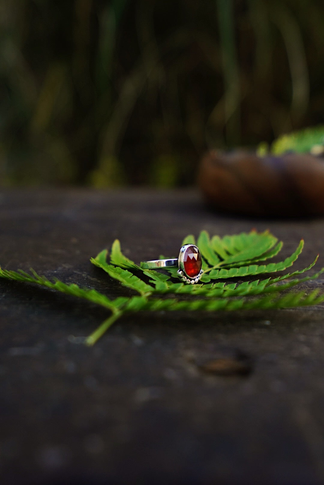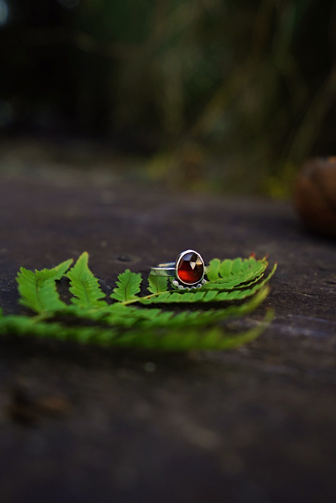 Handmade in sterling silver with a deep red garnet that glows like embers.